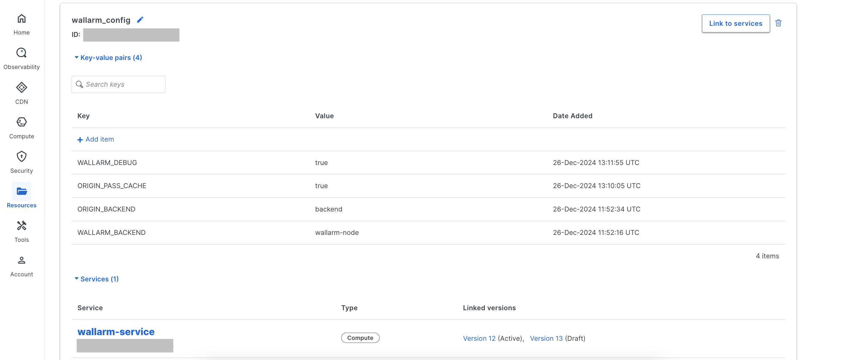 1. Go to Fastly UI → ResourcesConfig storesCreate a config store and create the wallarm_config store with the following key-value items: