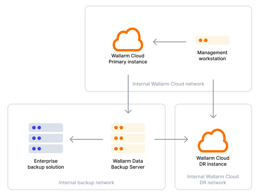 Note that the primary Wallarm Cloud instance will not send the data directly to the DR Wallarm Cloud instance, all data transfers are happening via the data backup server.