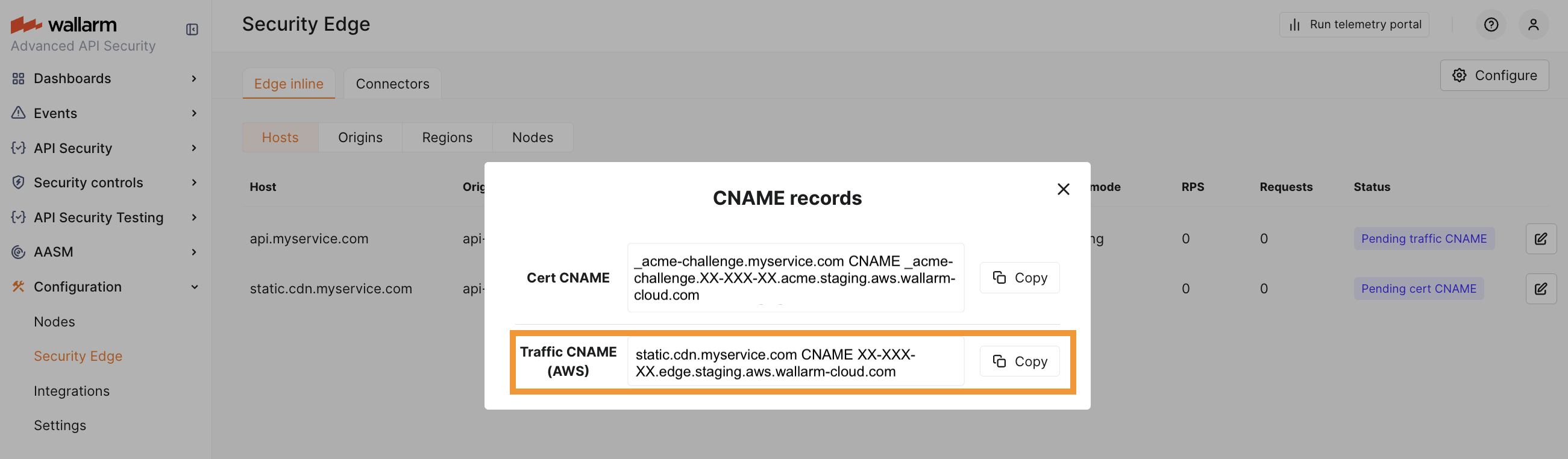 DNS changes can take up to 24 hours to propagate. Wallarm starts the Edge Node deployment once the CNAME records are verified (if needed).