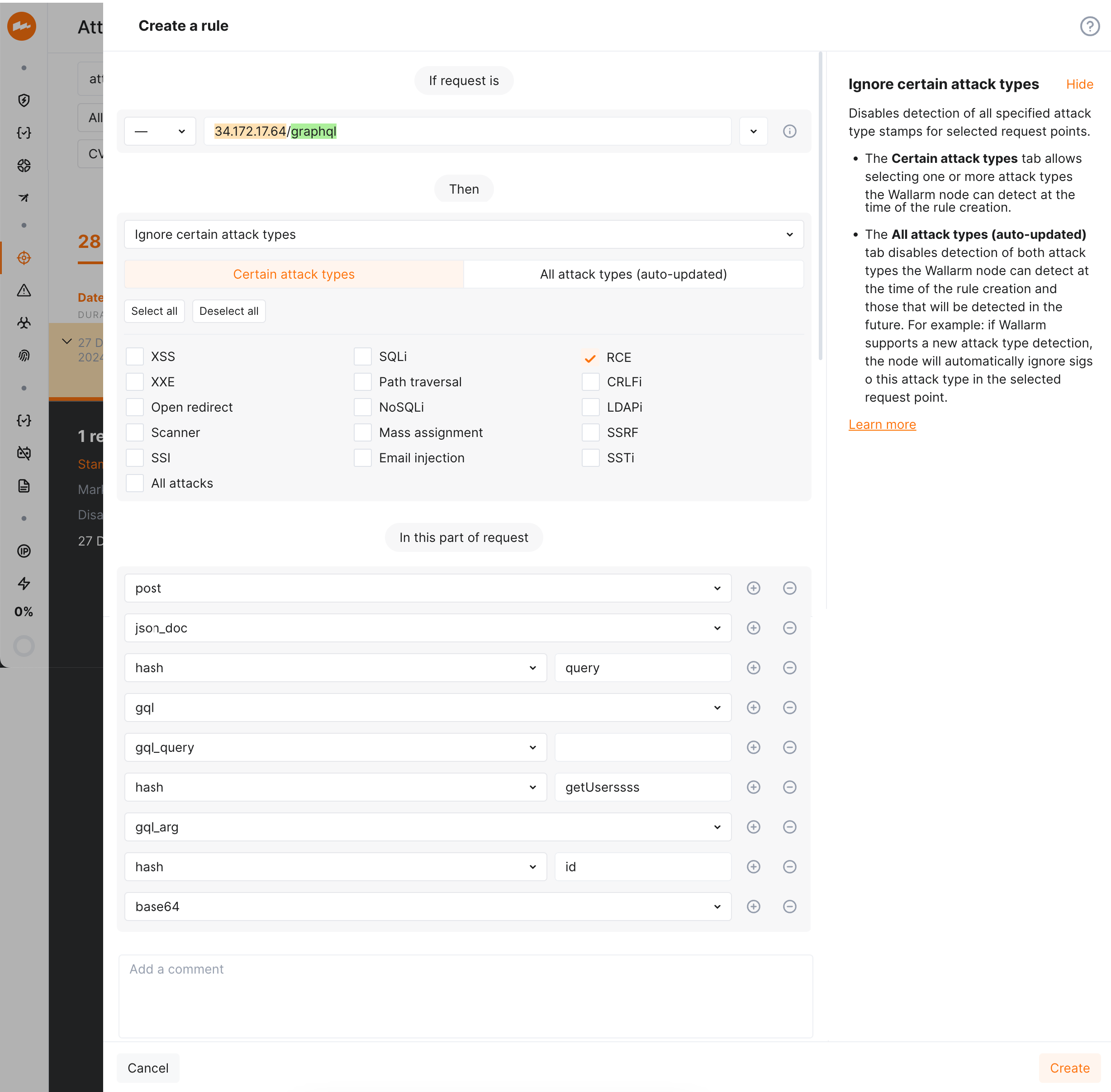 • Advanced rule application: apply granular protection rules to specific GraphQL request parts. This enables fine-tuning and configuring exclusions for certain attack types in defined parts of GraphQL request.
