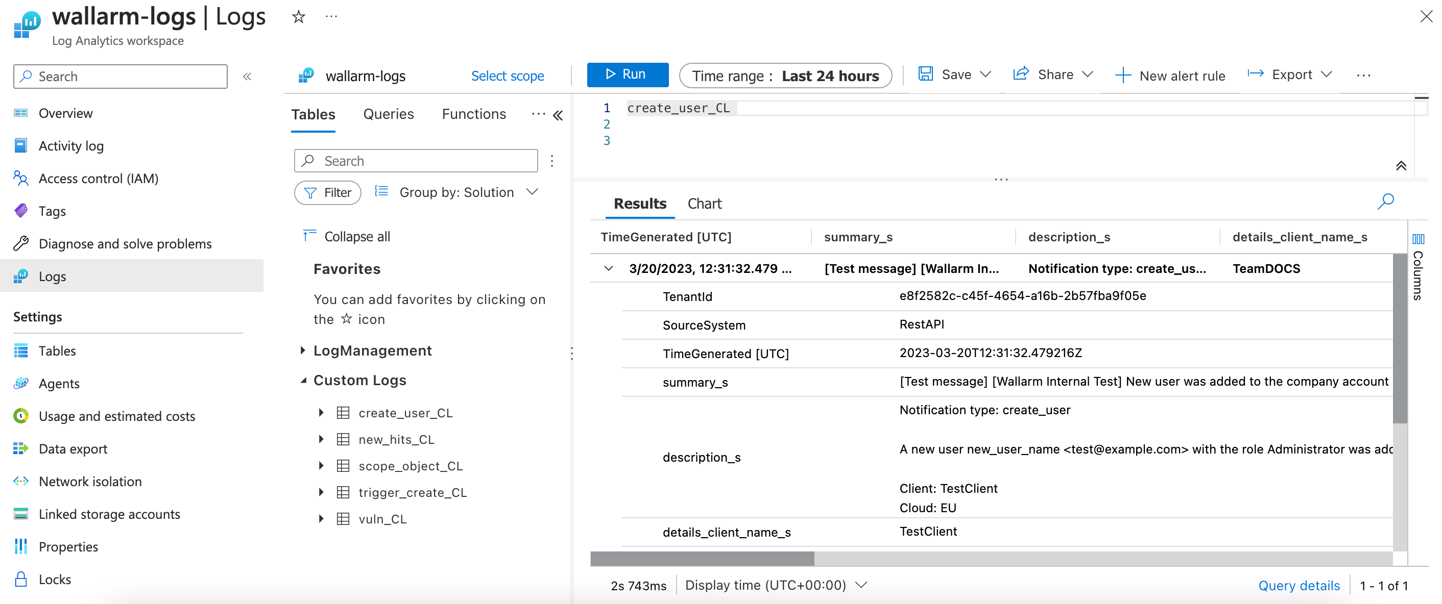 You can find Wallarm logs in your Microsoft Workspace → LogsCustom Logs, e.g. the test create_user_CL log in Microsoft Sentinel looks as follows: