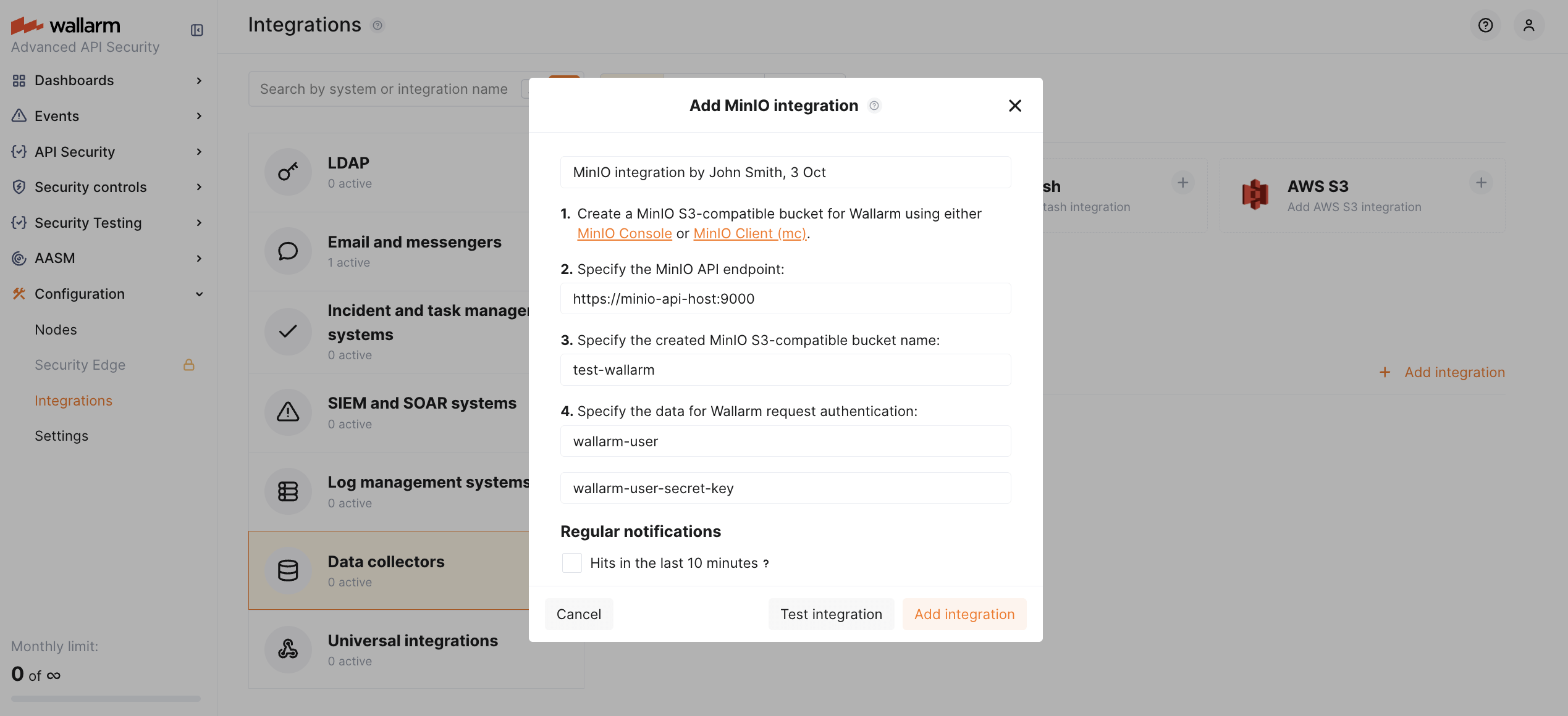 2. Proceed to Wallarm Console UI → IntegrationsMinIO block or click the Add integration button and choose MinIO.