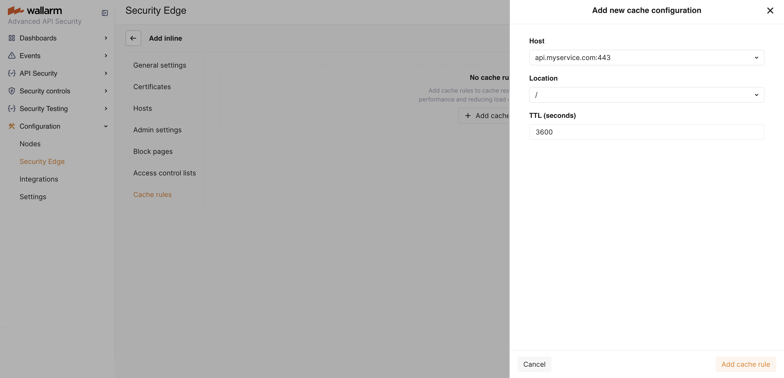 1. Go to Wallarm Console → Security EdgeInlineConfigureCache rules and click Add cache rule.
