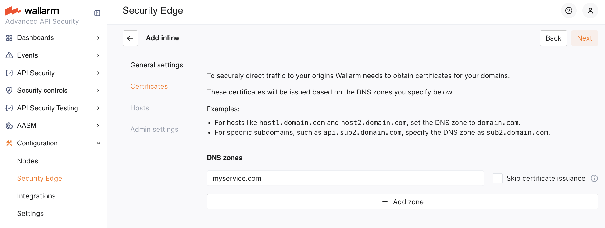 If the Edge Inline Node is deployed as a direct, Internet-facing solution, Wallarm requires certificates to securely route traffic to your origin servers. Certificates are issued based on the DNS zones specified in this section.