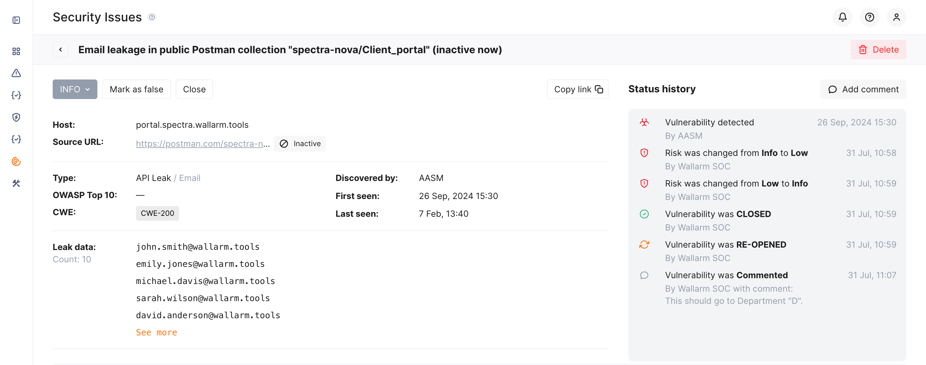 Once a security issue is detected, it obtains the Open status meaning some measures are required to mitigate it. In the issue details, you can close it (means it was resolved) or mark as false.